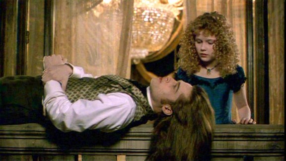 The film also benefits from subtle visual effects and makeup work provided by the great Stan Winston. The vampires in the movie are haunted and beautiful, with translucent pale skin, blue varicose veins, and glowing cat-like eyes. And, of course, fang-like teeth whenever they sense blood. The sequence where Claudia transforms into an undead creature is a seamless marriage of makeup and CGI effects as we witness her hair curl, child-like fangs grow, and her white skin fade. This is a little girl you do not want to encounter after sundown.