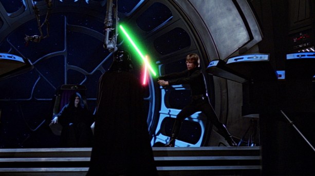 Only Luke Skywalker’s Jedi arc remains compelling and drives the rest of the picture. There is a beautiful scene where Luke asks Leia about her childhood memories of her birth mother, then confesses that they are brother and sister. And Luke’s determination to turn his father back to the side of good anchors the final confrontation between Luke, Vader, and the Emperor. One of the film’s darkest moments is when Vader taunts that he will turn his sister Leia to the dark side of the force, sending Luke into a violent rage during their climactic lightsaber duel.